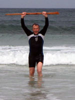 Wild and wet at 8; fair by 10 and the wind in the traditional SW. It hurls me along the northern circuit of North Uist. Moving with the wind, everything's quiet. Past Balranald, a sign to a picnic spot leads by a short track to Traigh Stir, and the finest of the sadly few beaches I get to. The strand is small, perfectly formed and north facing, so a good little swell is working in the offshore wind, which I duly sample. Three cyclists from the hostel arrive and do photos of me and the stick emerging from the deep.