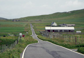 Buy supplies at Daliburgh co-op and stop for soup and coffee at Kildonan Museum. Barbara McKinnon's cooking is good and the museum, which I can't visit, has fine old photographs. Reach Howmore's Gatliff Trust hostel at 4 after 20 km. And the shop at Howmore has a licence! I visit the first of my beaches but it's dull with a strong onshore wind so I don't linger. Cattle wander round the township but nowadays are kept from the graveyards and church buildings, ruinous but majestic and perhaps 13 centuries old.